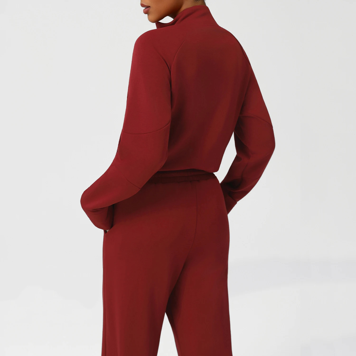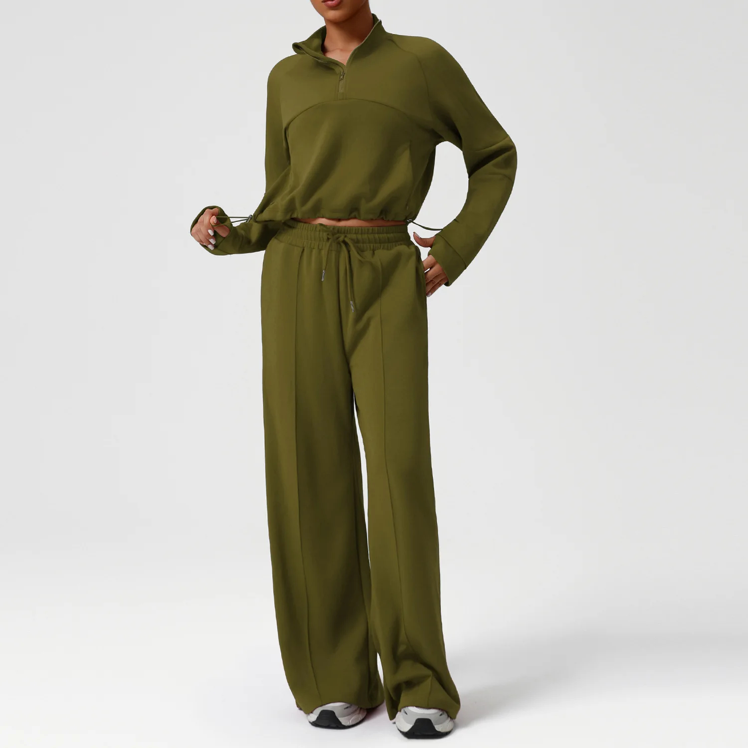 Featuring a stylish half-zip mock neck, the top adds a modern, sporty touch to the ensemble. The adjustable zipper lets you customize coverage for comfort, while the cropped hem complements the pants’ silhouette for a balanced look.