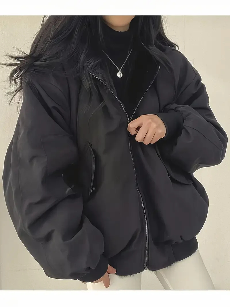 Zip-Up & Oversized Design: Featuring a zip-up front and an oversized silhouette, this jacket adds a relaxed and modern touch to your look, providing practical functionality for cold weather.