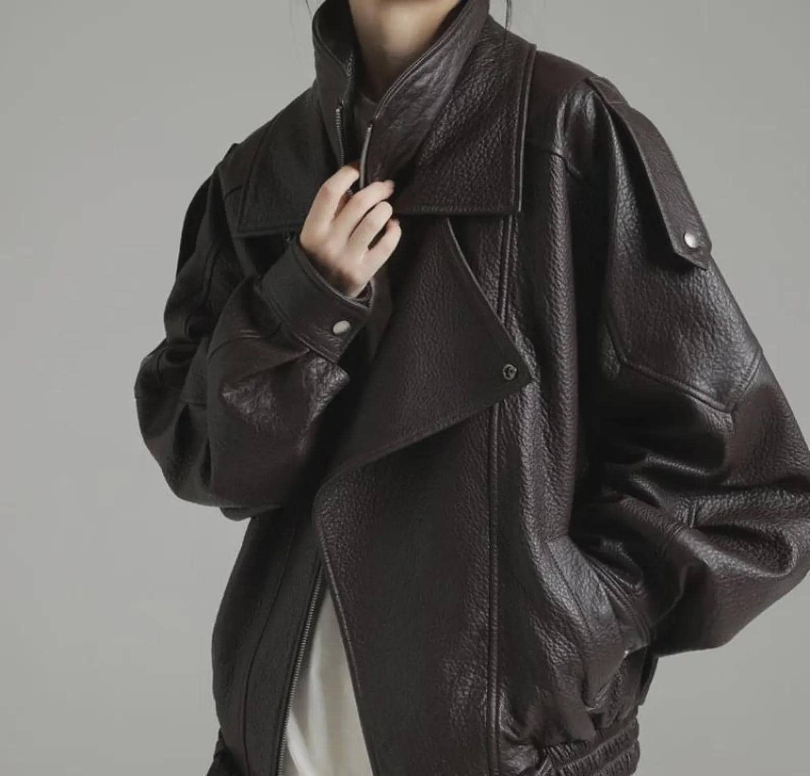 Women's Oversized Genuine Leather Bomber Jacket, , Women leather jacket ykk style , Gift for her