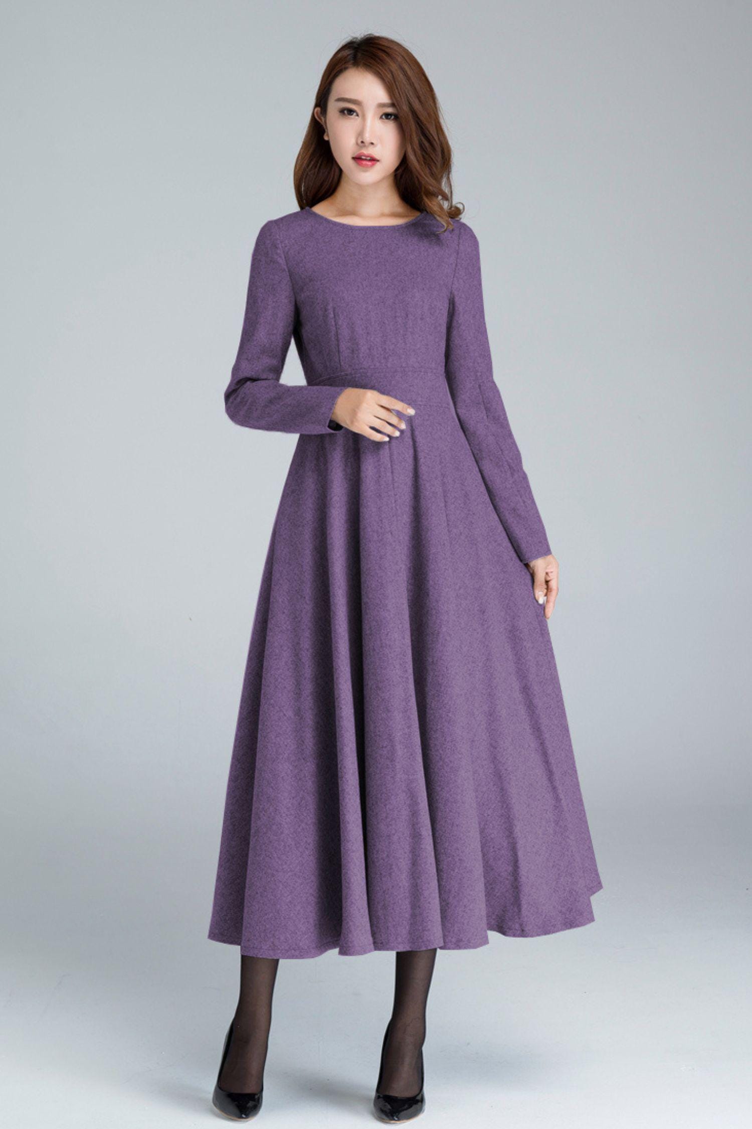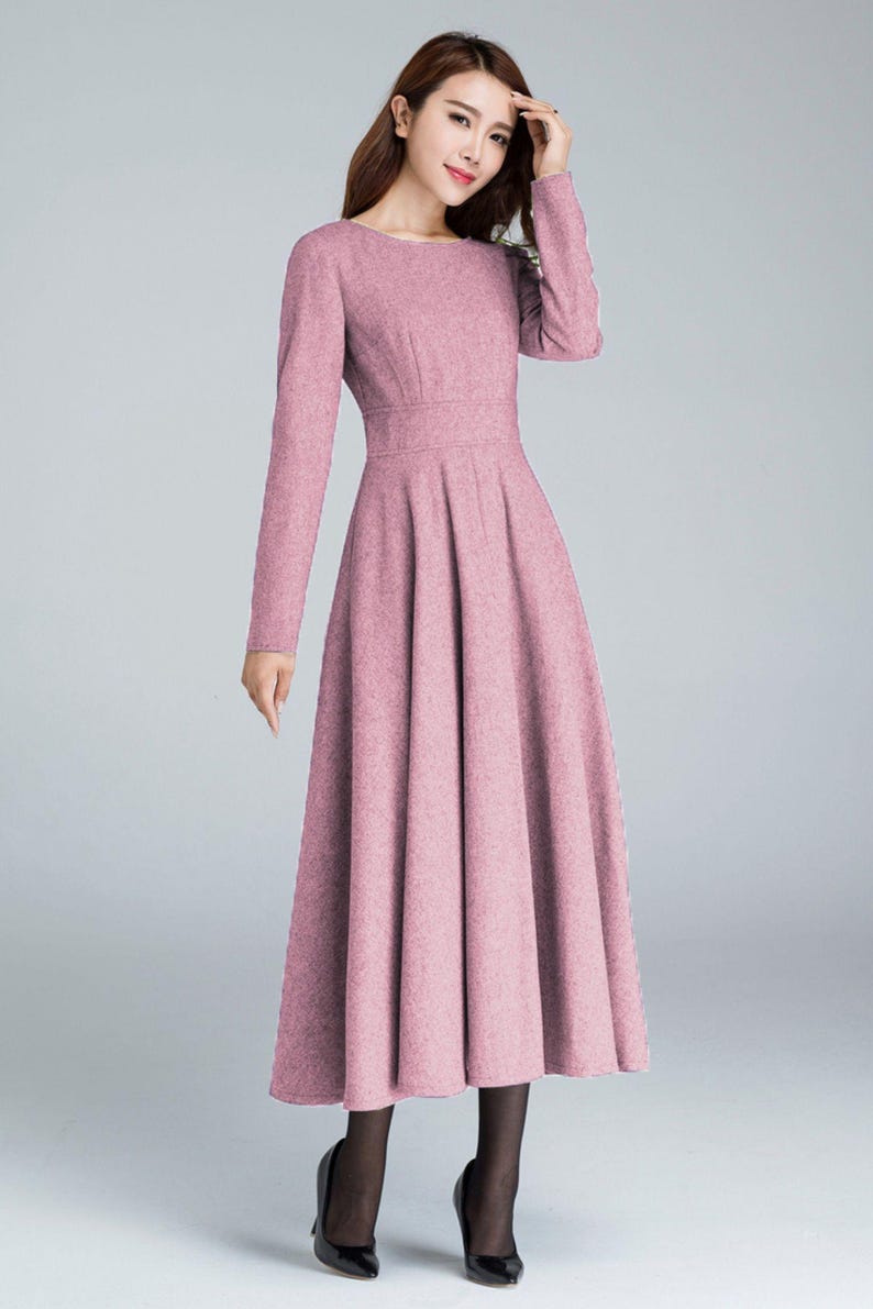 Women’s Pink Wool Midi Dress: Long Sleeve A-Line Fit-and-Flare Winter Dress, Custom, Xiaolizi 6515