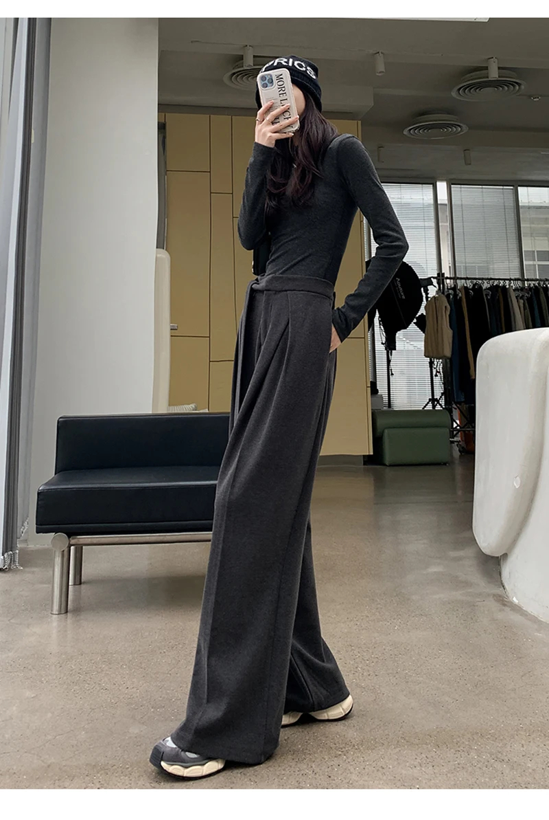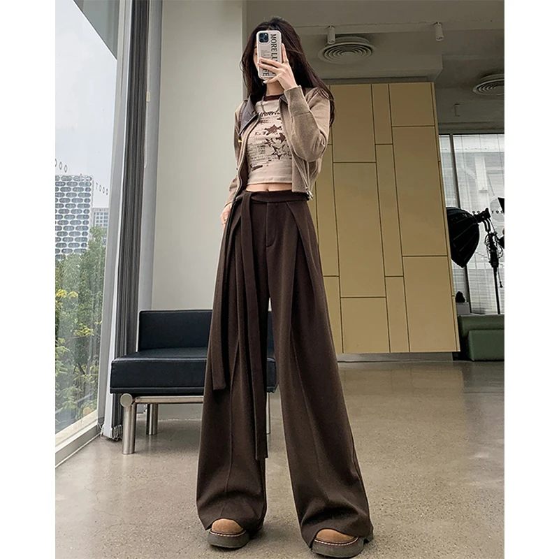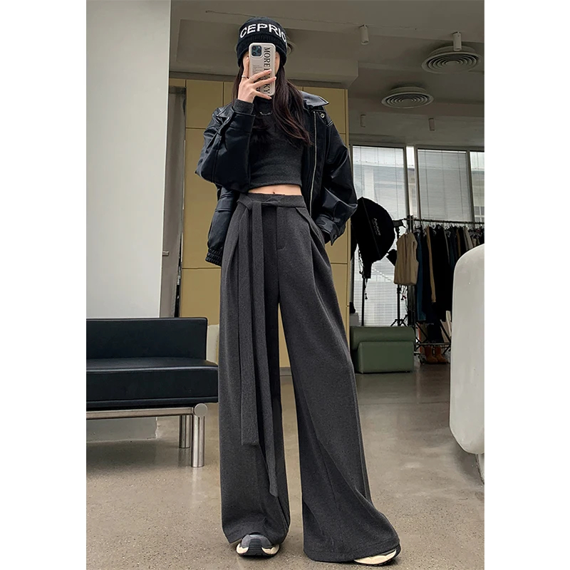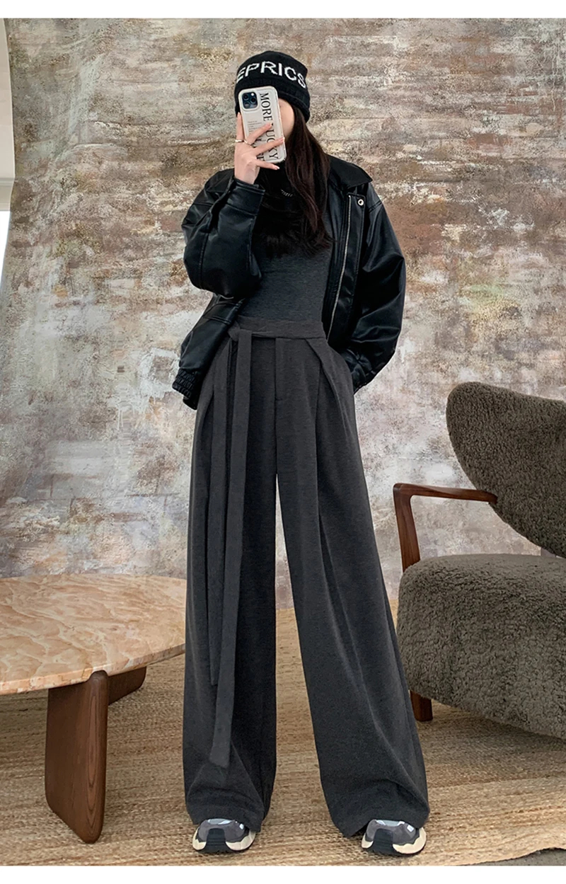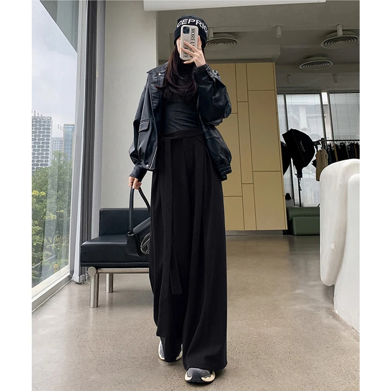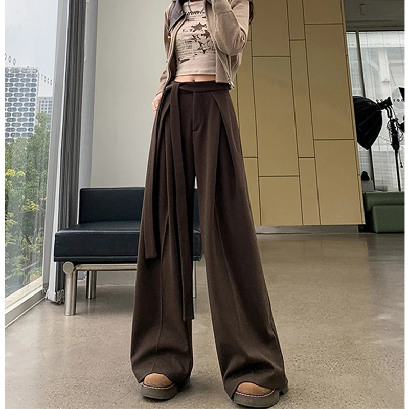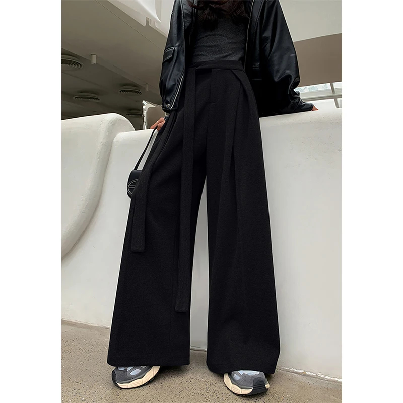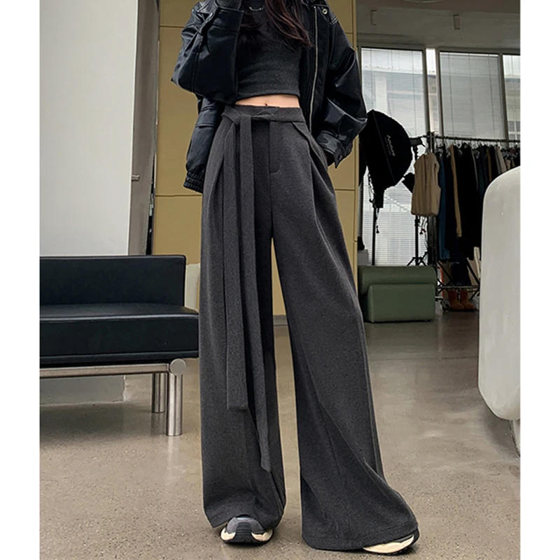 Woolen Wide Leg Pants Women Fashion Lace Up Black Baggy Suit Pants Winter Streetwear Korean Casual Straight Trousers New
