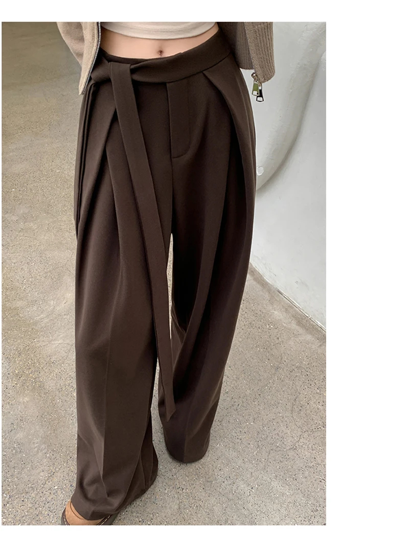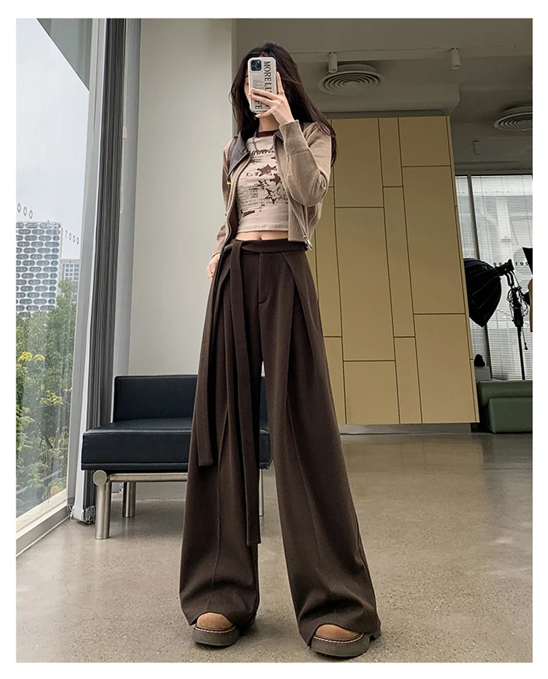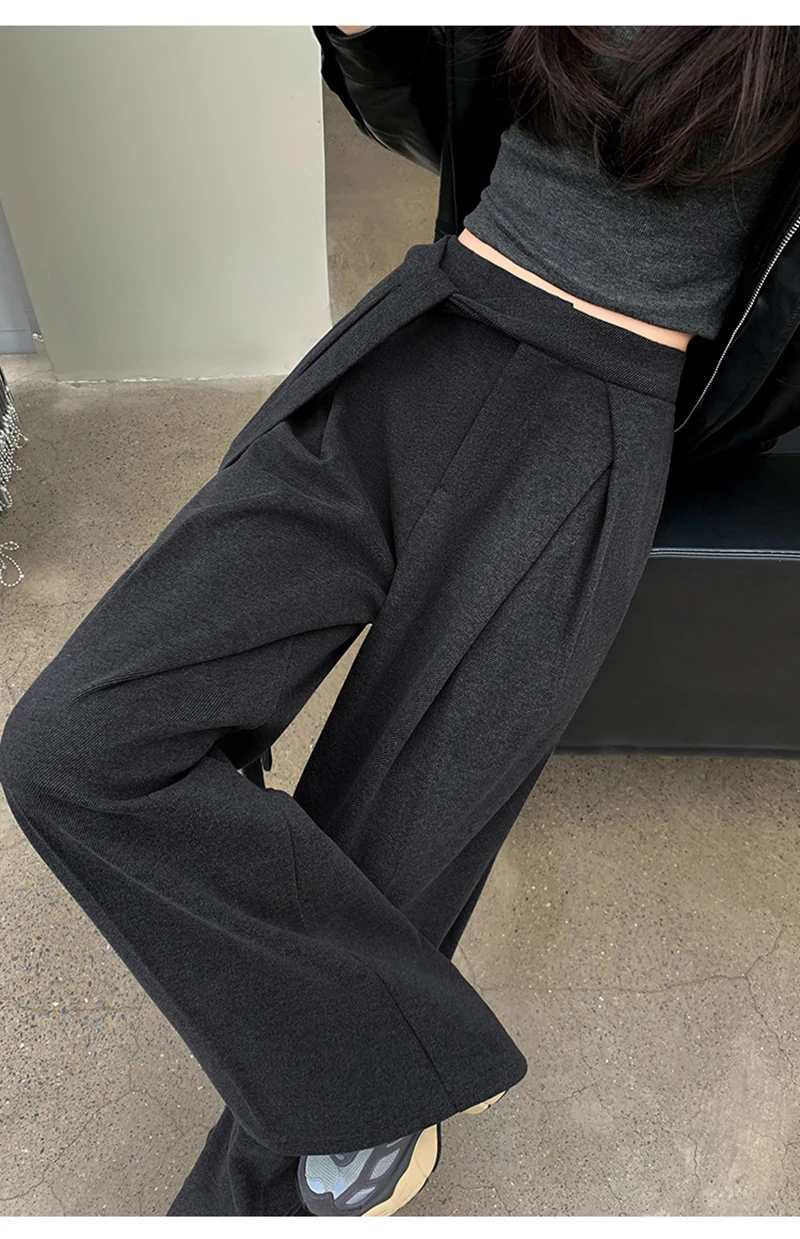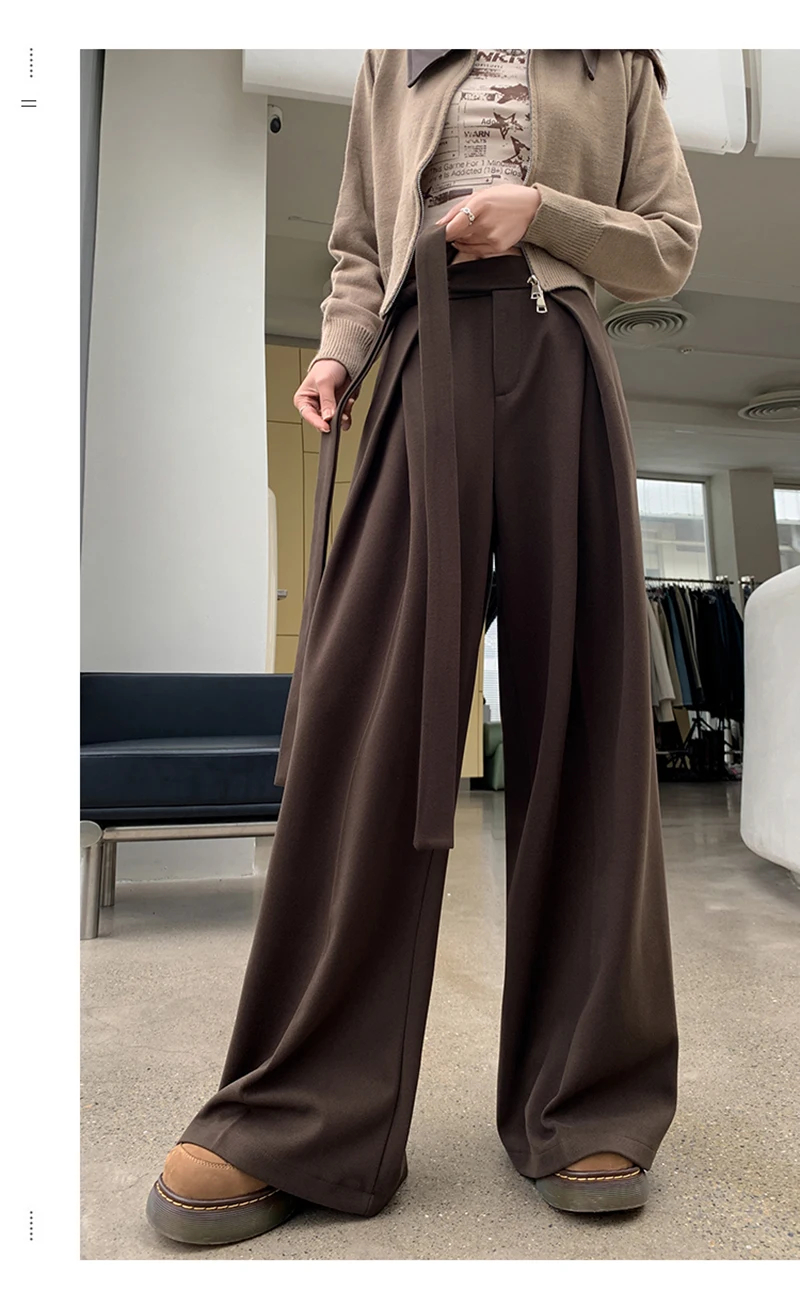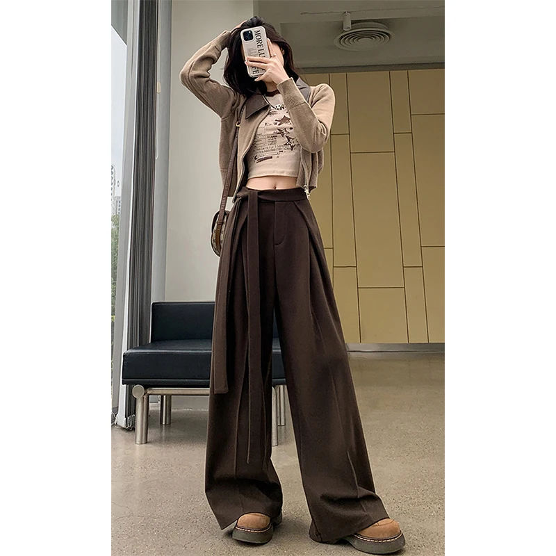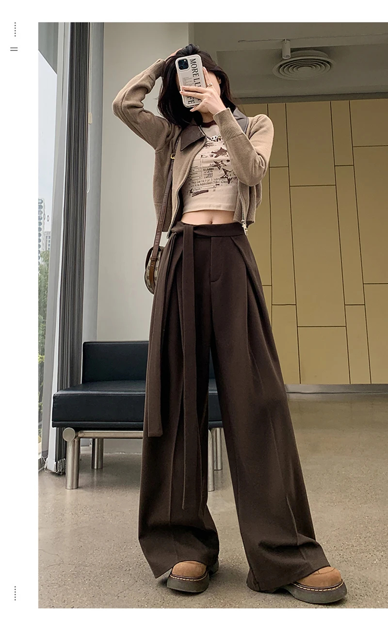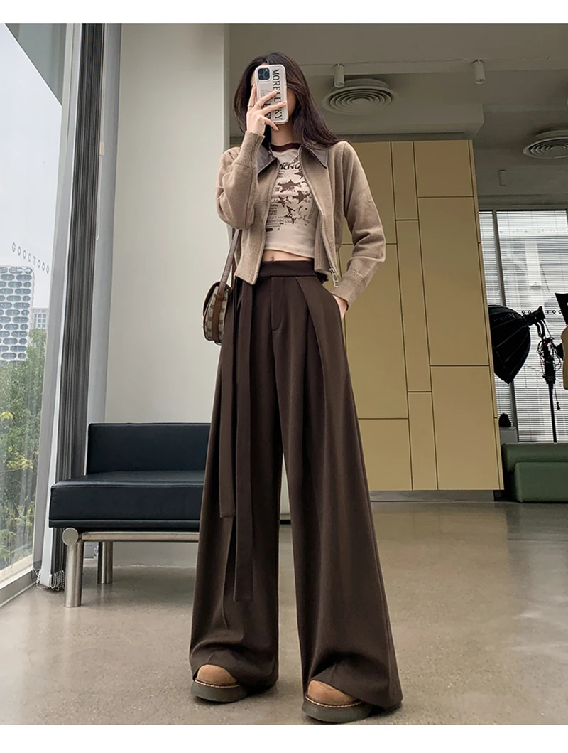 Woolen Wide Leg Pants Women Fashion Lace Up Black Baggy Suit Pants Winter Streetwear Korean Casual Straight Trousers New