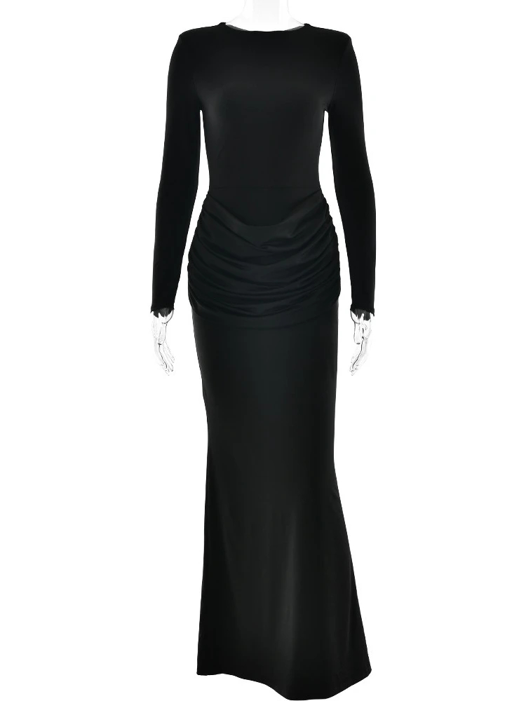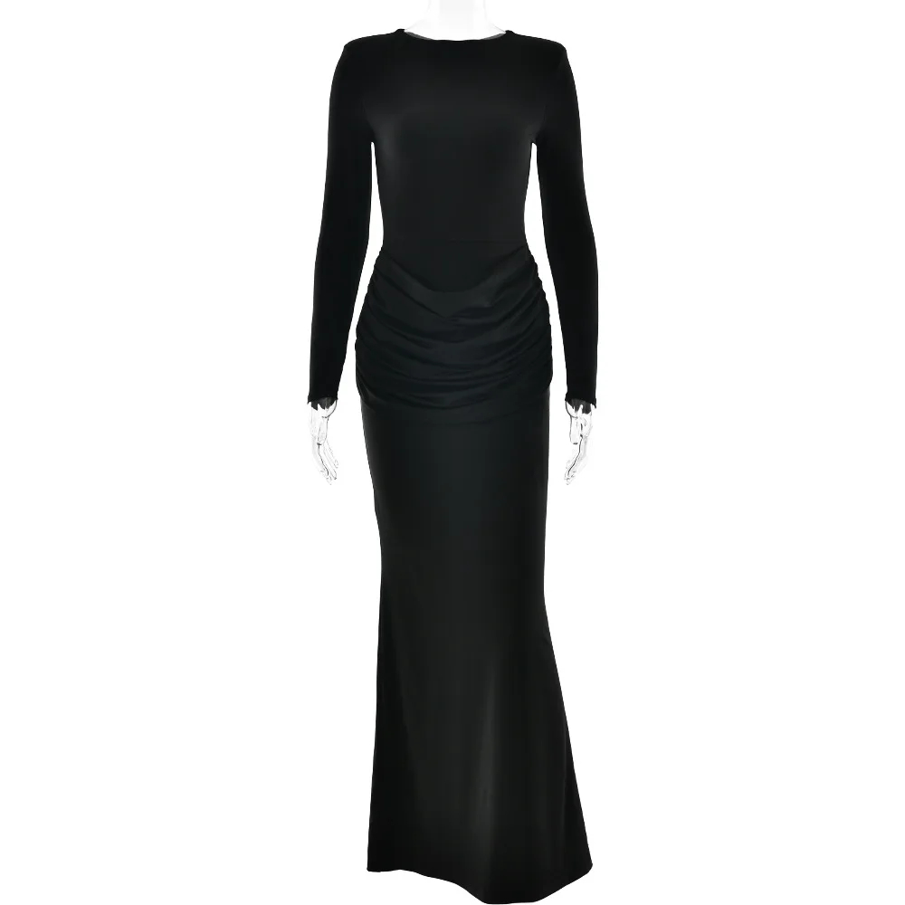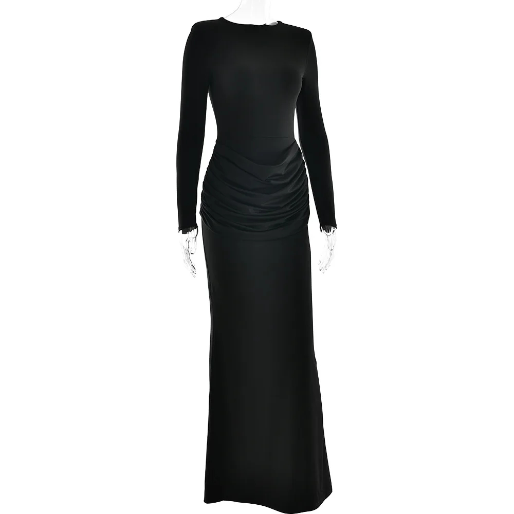 XIAOTANG Long Sleeve Ruched Sexy Maxi Dress for Women Gown Autumn Winter New O Neck High Waist Bodycon Club Party Long Dresses